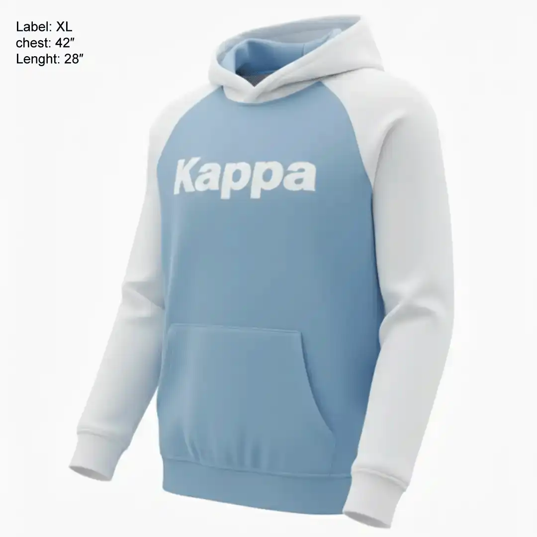 Step out in retro athletic fashion with this Kappa Color Block Raglan Hoodie. The striking combination of light sky blue across the body and crisp white raglan sleeves delivers a vibrant, sporty aesthetic. The hoodie proudly displays the classic Kappa logo prominently on the chest. Designed for maximum comfort, it includes a generous hood, soft cuffs, and a practical front kangaroo pocket. This piece is a must-have for fans of vintage streetwear, football culture, or simply comfortable, eye-catching casual wear.