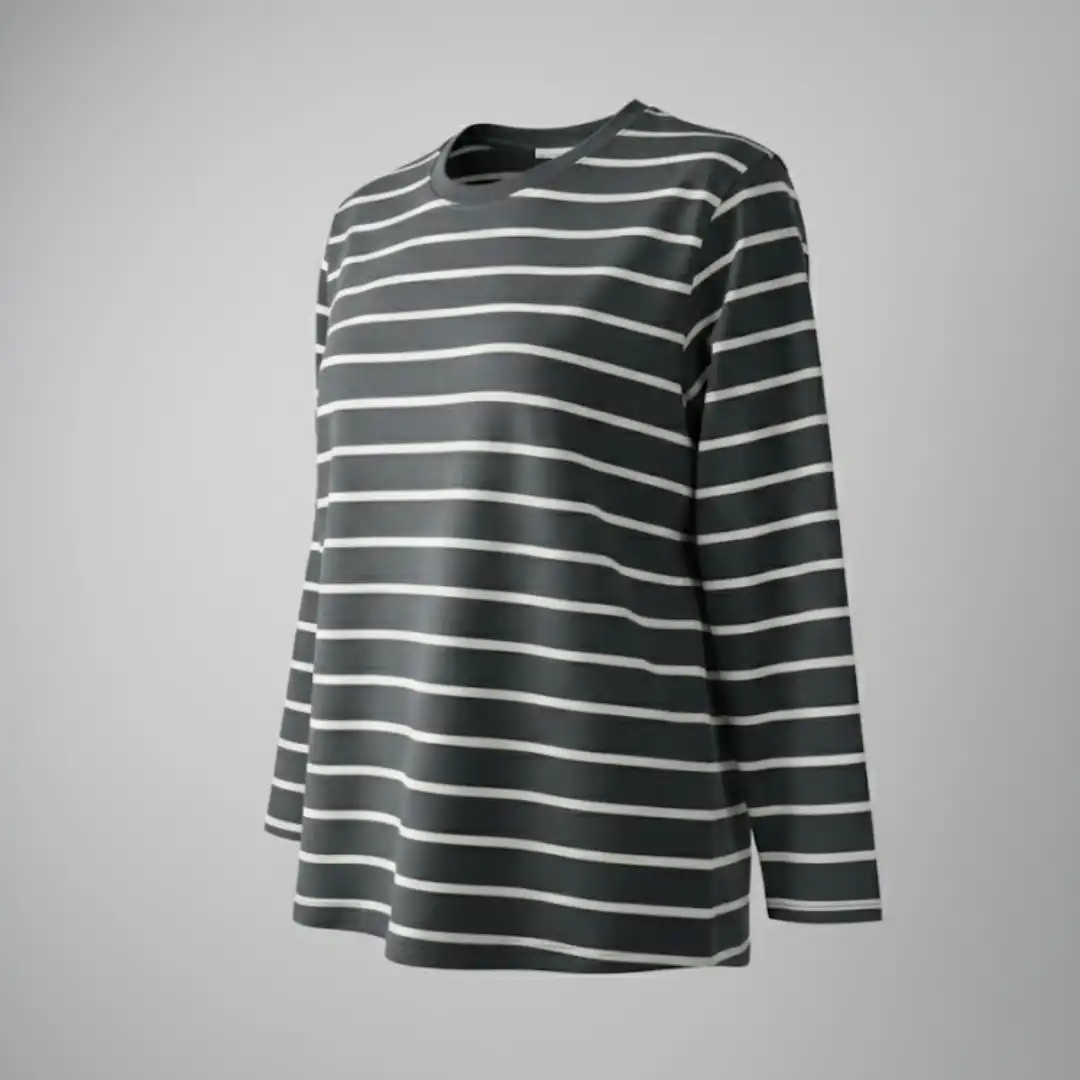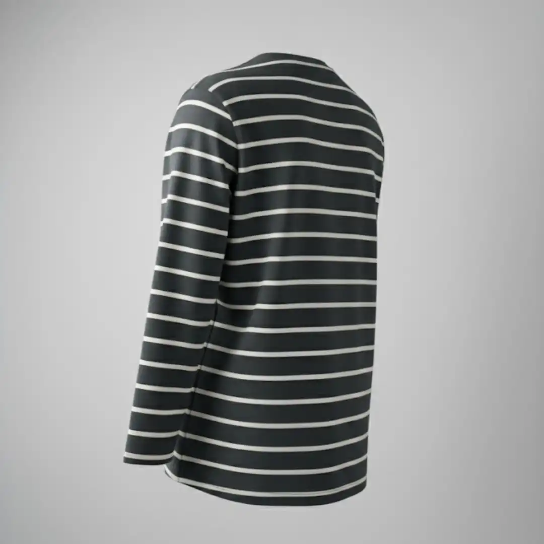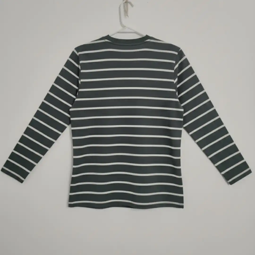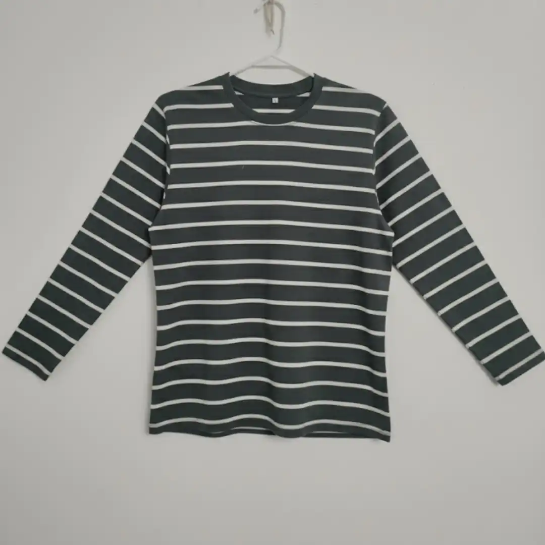 A comfortable and stylish men’s long sleeve t-shirt featuring a timeless dark gray and white horizontal stripe pattern. Perfect for casual wear and layering.
