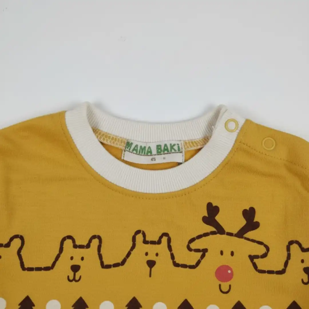 Festive Character Print: Features cute rows of reindeer with red noses, brown bears, snowmen, and little pine trees, all set on a cheerful mustard yellow background.