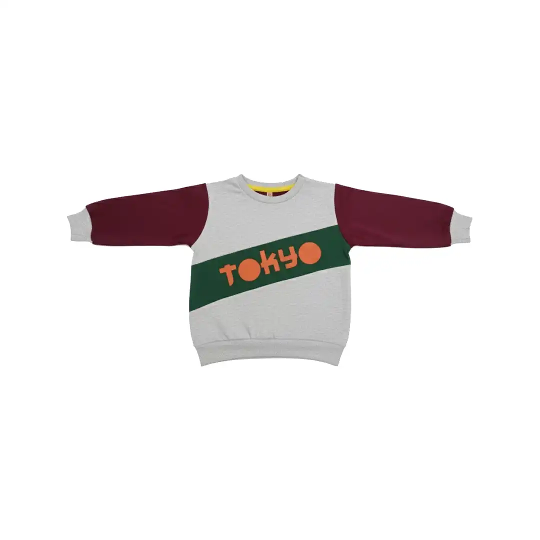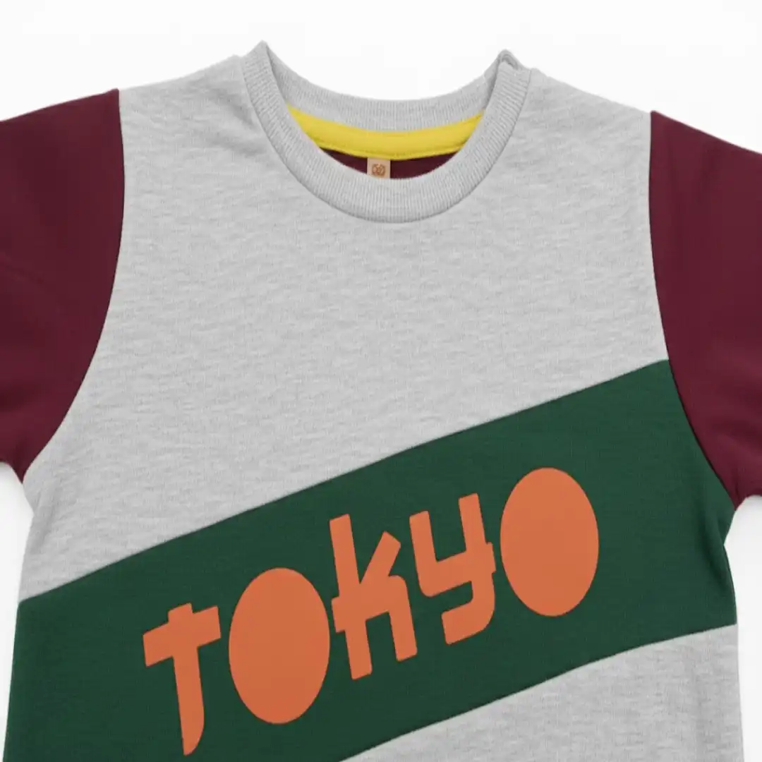 Keep your little one cozy and trendy with this Tokyo Printed Kids Sweatshirt. Designed with a fun and modern “Tokyo” print across the chest, this sweatshirt features a stylish color-block design with maroon sleeves and a soft grey body. The premium cotton-blend fabric ensures warmth, comfort, and durability, making it ideal for daily wear, outdoor play, or casual outings.